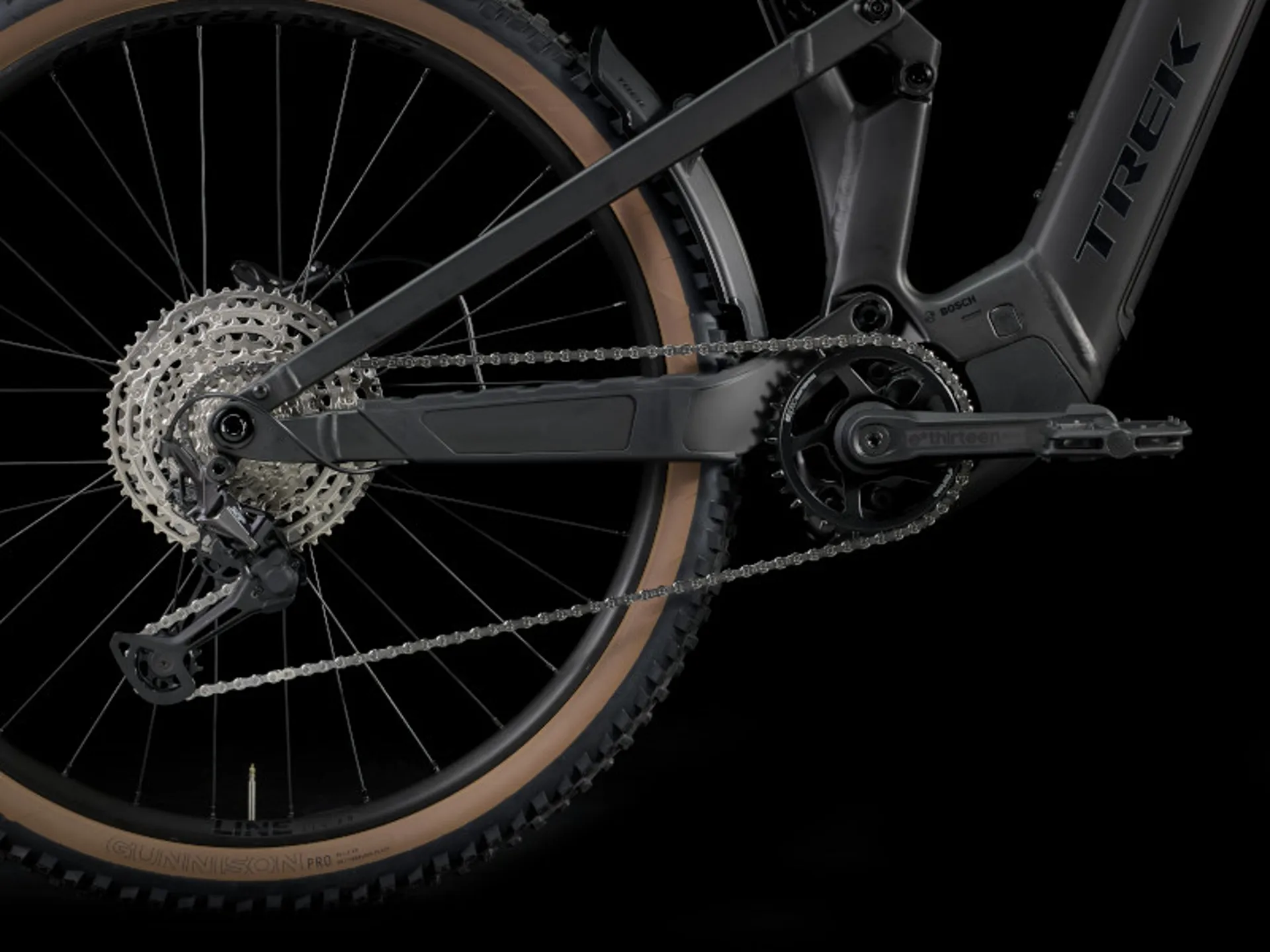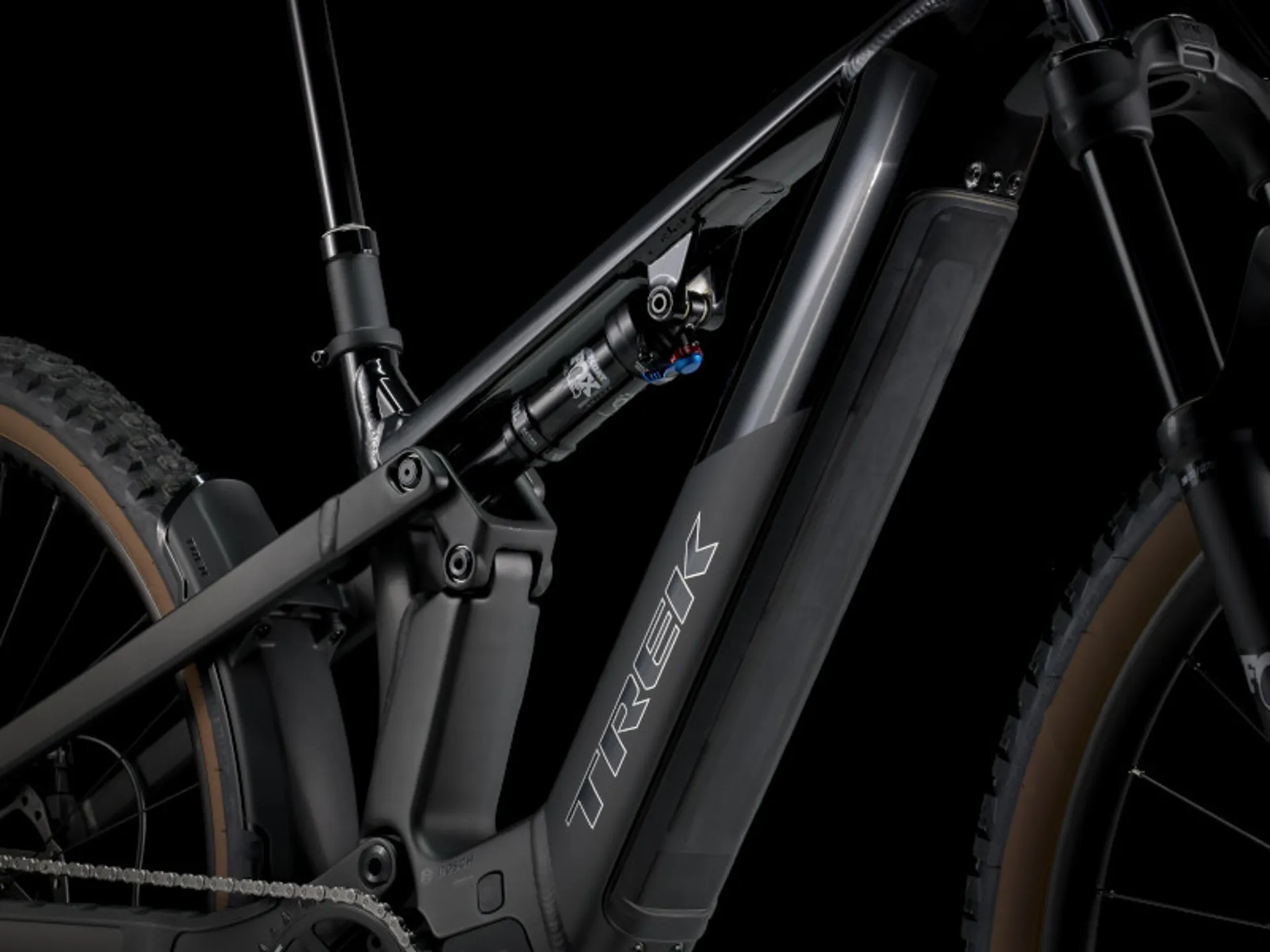 The tech you get - An Alpha Platinum Aluminium frame with a Bosch Performance Line CX motor (85 Nm, 250 W), a huge 800 Wh PowerTube RIB 2.0 removable integrated battery and Purion 200 controller. 130 mm front and 120 mm rear suspension from a FOX Float AWL fork with an air spring and RAIL 2.0 damper and a FOX Float Rhythm shock. Tubeless-ready wheels with puncture-resistant 2.4˝ tyres, a 12-speed Shimano SLX drivetrain for clean shifts, a Bontrager Line dropper post and hydraulic disc brakes.